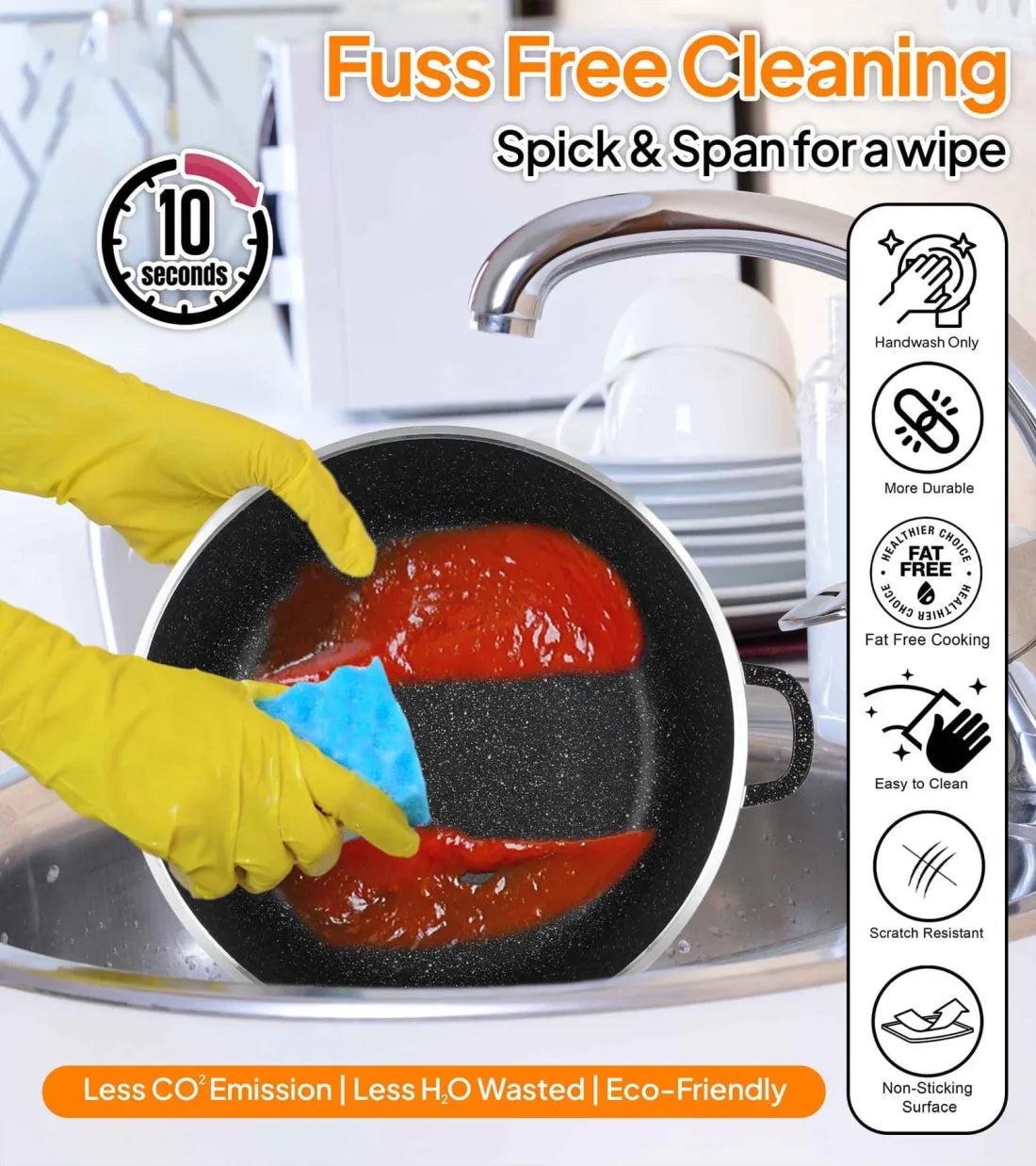 - -EASY TO CLEAN: Handwash only. Has excellent surface. Even the most stubborn ingredients like thinly sliced mushrooms or diced onions slid right off without leaving any residue. Additionally, the sides of this frying pan have wide curves at the bottom so it makes it easy to stir food and specially to clean the pot after usage. The pan curves gently into the bottom, making getting every last bit of sauce or whatever (and making clean up) a breeze! No corners for food to get stuck in